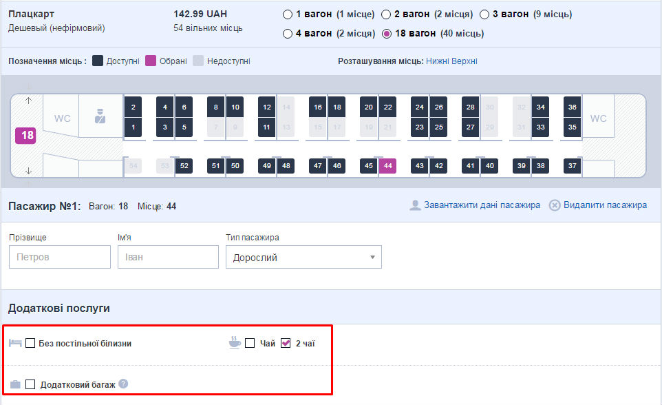 Система підбере відповідні потяги. Визначтесь із потягом, класом вагона і відмітьте бажані місця на карті місць.
